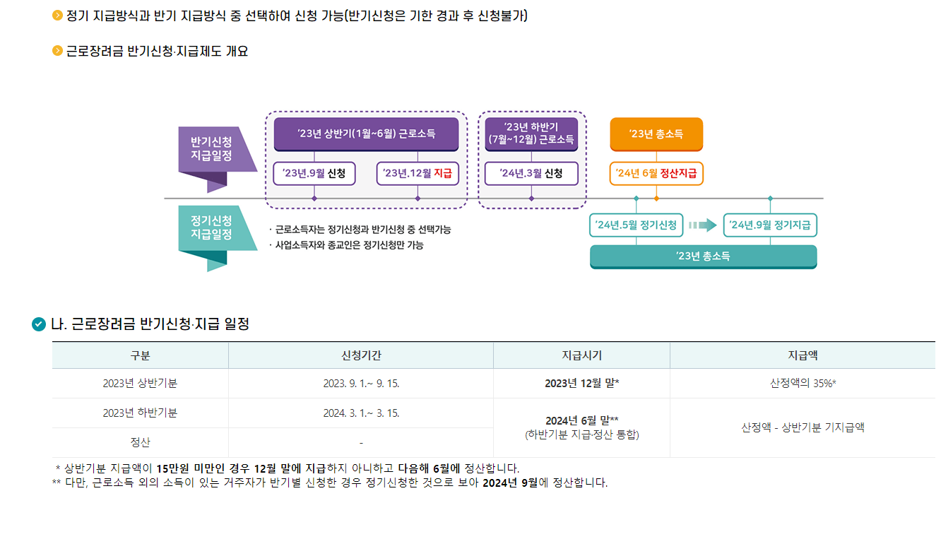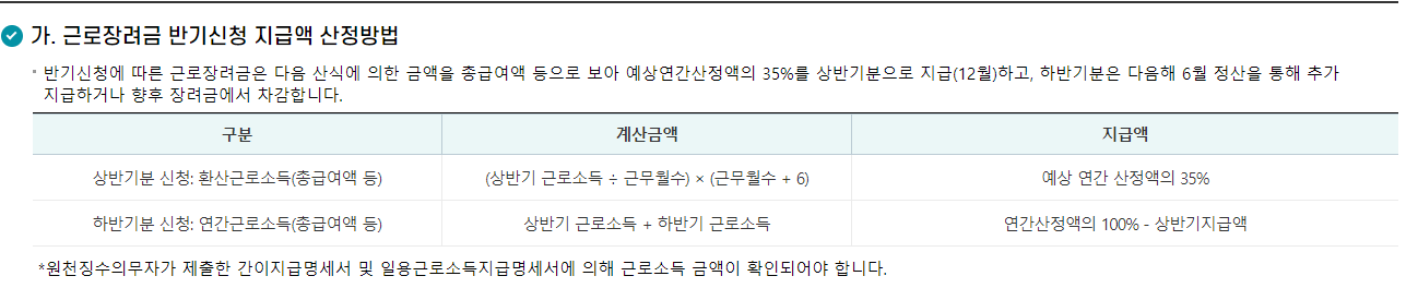 반기신청은 예산 연간산정액의 35%를 상반기분으로 지급하며, 하반기분은 상반기 근로소득+하반기 근로소득을 계산하며