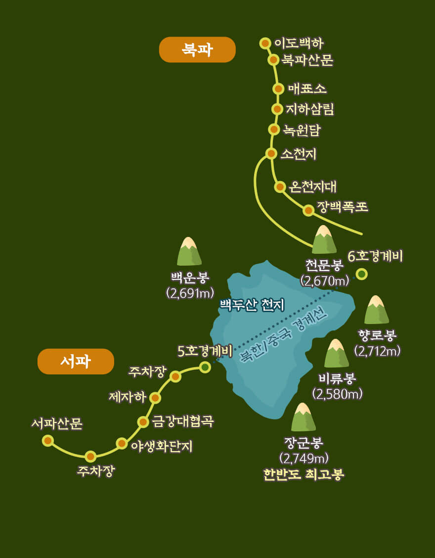 - 천지를 가까운 위치에서 조망할 수 있는 백두산 천문봉 북파코스